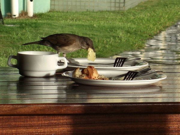 | De dag begon met een heerlijk ontbijt. We genoten van warme en koude gerechten, een heerlijk bakje koffie en werden op de koop toe toegezongen door een Grikibi. Dit is een klein vogeltje met een zeer opvallende gele buik. | |