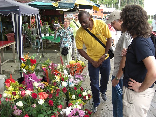| Allereerst kwamen we langs een bloemenmarkt. Er werd ons uitgelegd dat men in plaats van bossen bloemen liever bloemstukjes geeft. De kleuren van de bloemen zijn gekoppeld aan een bepaalde viering.