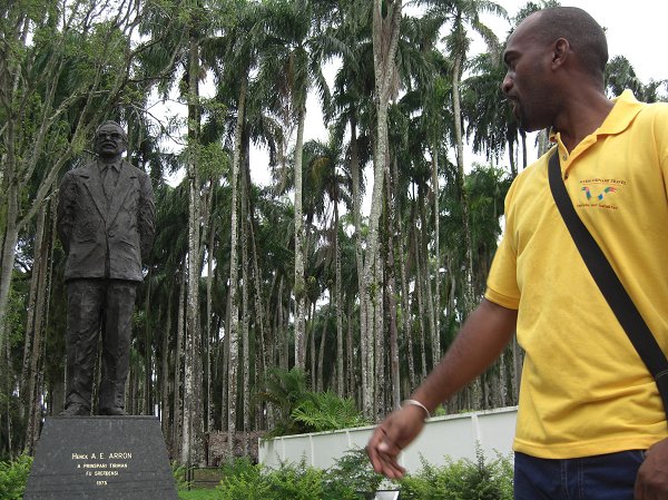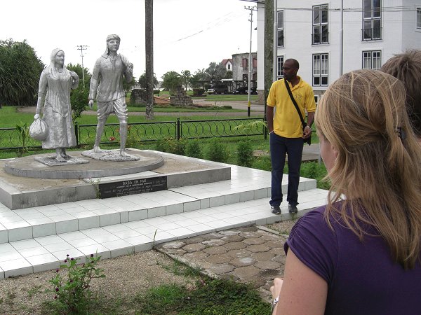 | Langzamerhand liepen we richting het oudste gedeelte van Paramaribo. We passeerden diverse beelden die herinneren aan de rijke geschiedenis van dit land en de multiculturele samenstelling ervan. Ten eerste zagen wij het aluminium beeld van Baba en Mai. Zij staan symbool voor de Hindoestaanse contractarbeiders, die vanaf 1873 naar Suriname kwamen. Het motto van het beeld is: ‘waar het mij goed gaat, daar is mijn vaderland’.Dit lijkt ons een heel goed uitgangspunt voor een tolerante samenleving. | |