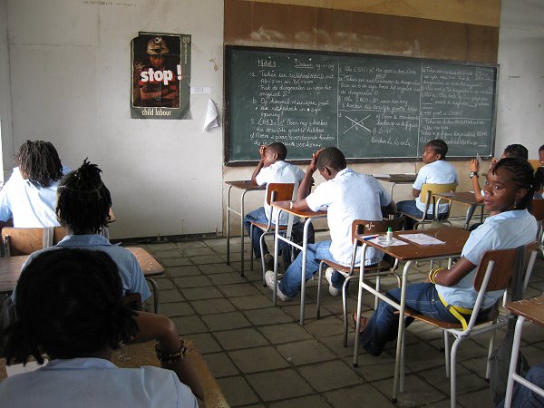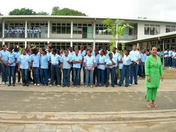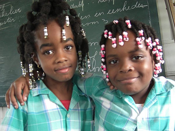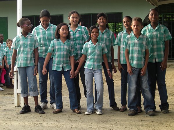 Ook hier zijn de 3e en 4e klassen gesplitst in A (lfa) en B(éta) richtingen. Van deze school doen twee 2e klassen mee aan de Learning Circles. Halverwege de ‘schooltour’ moesten we “piepen” (= kijkje nemen ) in de bibliotheek. Daar ontdekte collega Tineke ook een boek van Carry Slee….. Een titel die haar en Hanneke niet echt bekend voorkwam. De school heeft ook een ICT ruimte waar ongeveer 20 computers stonden, die o.a voorzien waren van de Encarta Encyclopedie. De schoolpopulatie is een afspiegeling van de spreiding van de bevolkingsgroepen in Suriname. In de Stad (Paramaribo) wonen de meeste Creolen en dat zie je ook terug op de scholen. Veelal hebben de Creolen puur Hollandse (de Vries) of Engelse (Dawson) achternamen. Hoewel de school katholiek is ( iedereen moet deelnemen de katholieke hoogtijdagen) viert men ook de religieuze hoogtijdagen van de andere geloofsgroepen. |