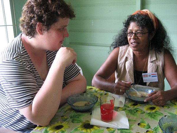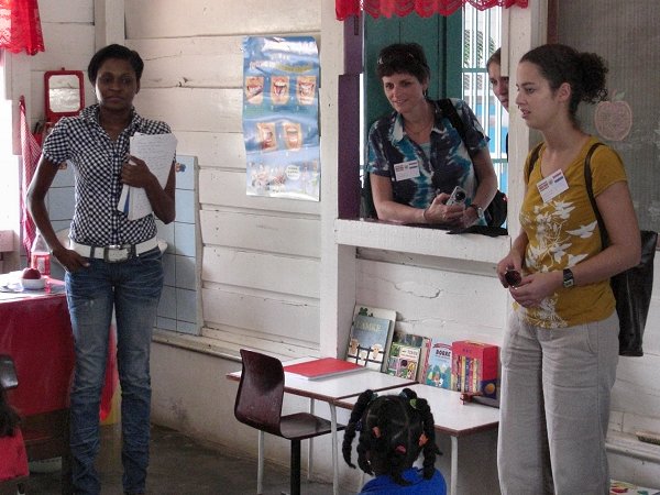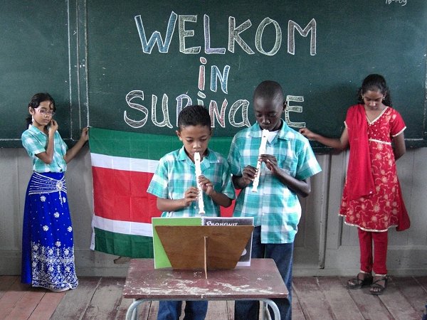 Ondertussen werd de Surinaamse vlag getoond door kinderen in klederdracht van de verschillende bevolkingsgroepen. Twee jongens lieten ons liedjes op de blokfluit horen. Onze algemene indruk waren twee enthousiaste leerkrachten; Shiefanie en Judith, een gezellige klas en een mooie mediatheek. Een zeer warm onthaal.