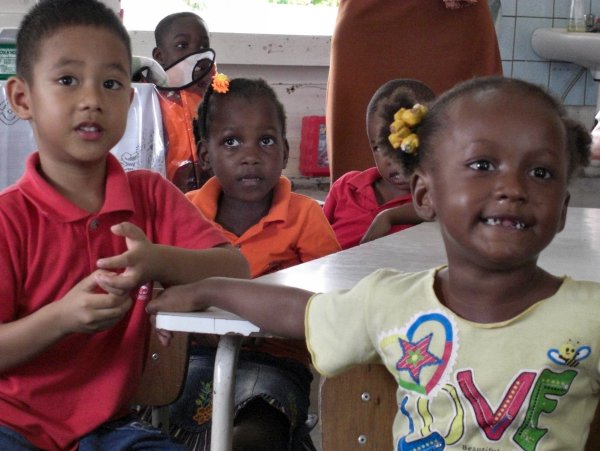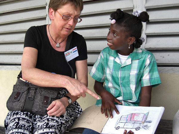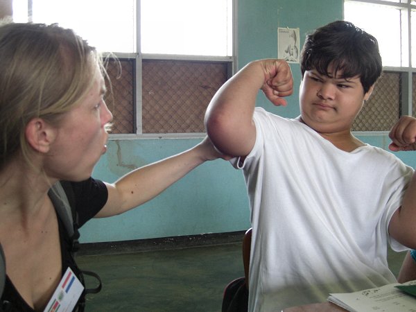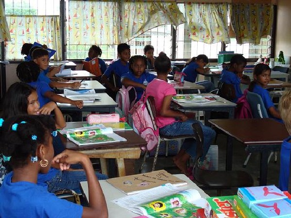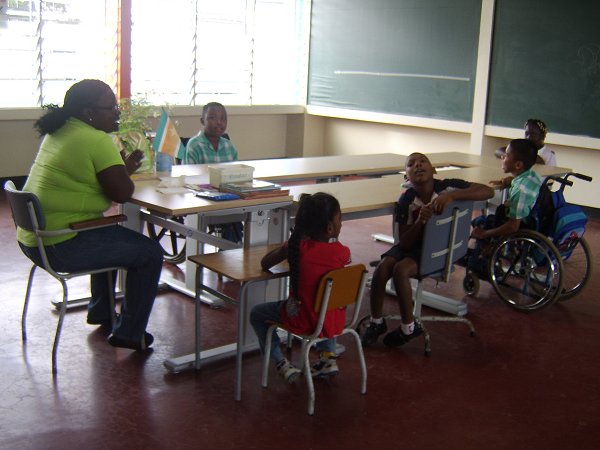Bij het vragenrondje bleek dat de teamleden geen specifieke opleiding buiten de PABO hebben gedaan om werkzaam te kunnen zijn in het speciaal onderwijs. Daar zijn in Suriname weinig mogelijkheden voor. Wel heeft 1 teamlid een opleiding voor RT gedaan en zij wordt ook als RT- er ingezet. Daarnaast is er een teamlid met kennis van logopedie, die op dat gebied wordt ingezet. De school kan eventueel een beroep doen op specialisten vanuit het MOB, dit is een overkoepelende organisatie die ook de indicatiestelling van de leerling regelt. In een aantal gevallen kan ook het pedologisch instituut worden ingezet ter ondersteuning van de leerkrachten. Net als in Nederland wordt er gewerkt met handelingsplannen. De vorderingen van de leerlingen worden iedere dag door de leerkracht bijgehouden in een observatieschrift. Dit is vergelijkbaar met het leerlingvolgsysteem. Vervolgens begonnen we met de rondleiding langs de diverse groepen. We zagen kleine groepen die alleen bemand werden door leerkrachten, van klassenassistenten is geen sprake. De groepen zijn ingedeeld op leeftijd. In het verleden was getracht dit te doen op niveau, maar dit was geen haalbare kaart. Op de school wordt aandacht besteed aan een aantal praktijkvakken t.w. koken en textiel. Wegens ruimtegebrek wordt textiel gegeven in een groep waar tevens de reguliere les wordt gegeven. Waar we op deze school stil van werden is het feit dat de leerkrachten met weinig leermiddelen en materialen (meubilair, inrichting lokaal) proberen het beste van de leerling naar boven te halen. Zo zagen wij een juf die met al haar ziel en zaligheid muziek gaf aan de leerlingen die duidelijk hiervan genoten. Wat een uitdagende taak ligt hier voor de leerkrachten om deze leerlingen alle kansen van de wereld te bieden ! Verslag door Petra en Hetty |