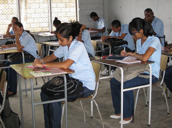 Er werken een totaal van 24 docenten De school staat hoog aangeschreven waardoor er leerlingen vanuit heel Paramaribo en buiten districten de school bezoeken. De school begint ’s ochtends om half acht en er zijn leerlingen die al om half zes de deur uitgaan. In leerjaar twee wordt gekeken of dat de leerling in een A-klas (alpha vakken) of een B-klas (Beta vakken) geplaatst worden. Bij de vraag in de B klas naar hun vervolgopleiding bleek dat het merendeel door wilt stromen naar Havo/Vwo. De klasse grootte is gemiddeld 25 leerlingen. We hebben kennisgemaakt met de klas die deel zal nemen aan deze Learning Circle en dat is klas 2D. De leerlingen hebben er zin in. Deze klas is uitgekozen omdat zij kritisch zijn en hebben duidelijk een eigen mening. Opvallende punten: school uniform – Mulo scholen: een spijkerbroek een een lichtblauw overhemd. Talen: naast het Nederlands en Engels krijgen de leerlingen vanaf klas 2 ook Spaans dat een hoofdvak blijkt te zijn en wordt 5 uur in de week gegeven. |