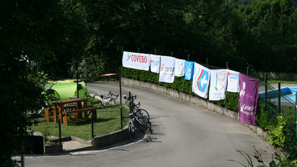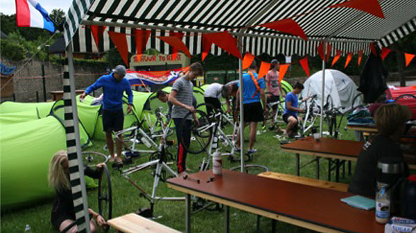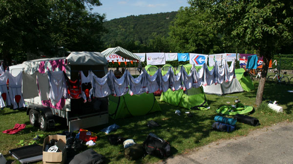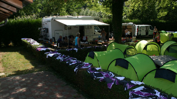 Dinsdag 10 juni 2014 – Fietsdag 1: Hunigue – Barr Vandaag werden we om 7 uur gewekt, iedereen had het er moeilijk mee. De avond ervoor was het namelijk nogal laat geworden. Na ons kamp opgeruimd te hebben was het tijd voor een heerlijk ontbijt, lunch maken en klaarmaken voor vertrek hoort hier uiteraard ook bij.Na het ontbijt kregen we een boodschap van Bas van de Goor zelf. Het was erg leuk om te horen dat hij onze expeditie een goed initiatief vindt en dat hij ons succes wilde wensen. Echt geweldig!Eerst een foto in Basel maken met het team, daarna was het tijd om te vertrekken. Eerst gingen we uit van 125 km (Basel-Barr), onderweg bleek dit valse hoop te zijn, want na een aantal km gefietst te hebben hadden we al het verkeerde fietspad te pakken. Dit zijn natuurlijk extra kilometers.Na 42 kilometer stonden Tom & Dennis klaar met gekoeld water, omdat iedereen door het warme weer zoveel dronk. Na weer 46 kilometer gereden te hebben was het tijd voor de lunch. Mario, Hanneke, Henk, Tom & Dennis hadden stoelen neergezet in de schaduw en voorzagen ons van de lunch. Helemaal top! Ook bij de laatste kilometers werden we voorzien van drinken, dit was allemaal al weer op. Eenmaal op de camping aangekomen waren er Nederlandse mensen de fietsers aan het toejuichen. Tevens waren de tentjes al klaar voor gebruik. Iedereen plofte neer en was uitgeput. Morgen gaan we het weer doen! Zometeen lekker eten en daarna op tijd naar ons bed, terwijl we op dit moment genieten van een plensbui. |