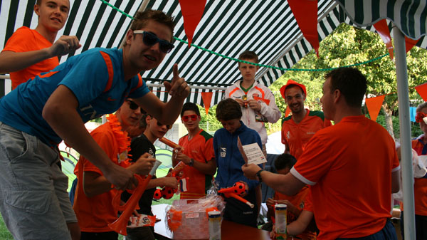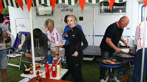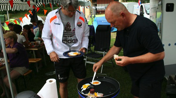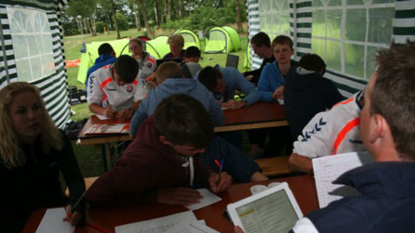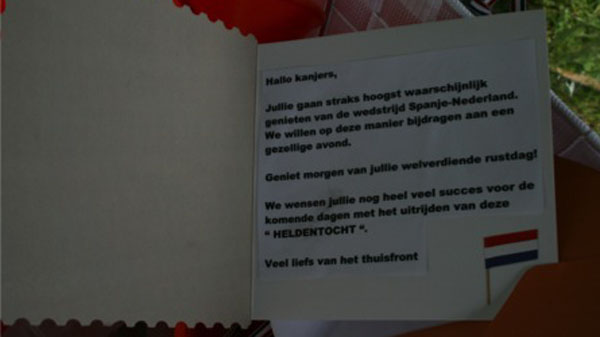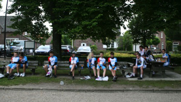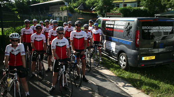 Maandag 16 juni 2014 – Fietsdag 6: Robbertville – Susteren Onze dag begon goed: ons ontbijt bestond uit lekkere stokbroden van de plaatselijke bakker en een warme bak koffie. Nadat we lekker gegeten hadden was het tijd om ons klaar te maken voor vertrek. Met 8 graden Celsius was het maar al te koud, arm en beenstukken waren ongekend onmisbaar. We gingen op weg naar het eerste rustpunt. We verwachtten hier over 2 uur aan te komen, maar toch verliep dit anders als verwacht: We waren goed op weg. Plotseling… tamtamtamtamtam… klonken er sirenes en werden we weggetrokken van de weg door de politie die zelf nog niet wist welke nationaliteit die had. We schrokken en meneer Brobbel en meneer Buitink hadden hun staart tussen hun benen zitten. Met moet in hun schoenen spraken ze met de politie. Buitink deed zich boos voor tegen de groep ;) en wij deden allemaal serieus mee, want zeg toch eerlijk: een boete van €210 per persoon voor niet netjes naast elkaar rijden is toch veel te gek? We moesten bijna mee naar het bureau, omdat we geen identiteitsbewijzen mee hadden, deze lagen in de volgauto. Uiteindelijk besloot de politie deze actie door de vingers te zien en om onze tocht te laten vervolgen. Om 16.05 u kwamen we aan op camping Hommelheiden in Zösteren. Een prachtige camping, opgezette tentjes, eten en drinken al klaargezet: wat wil je nog meer? Na een warme douche genomen te hebben was het tijd voor ons avondeten. Heerlijke spaghetti bolognaise en verse salades vulden onze leeg gefietste buiken goed. Zometeen, na de maaltijd, is het tijd voor een voetbalquiz! We hebben er allemaal zin in en zijn benieuwd wie er gaat winnen. Expeditie is bloed, zweet & tranen, maar het is er natuurlijk ook gezellig. Het is hier mooi en we genieten, toch is de drang om naar huis te gaan groot. We missen iedereen heel erg, we verlangen naar ons eigen bedje. Dit is geweldig, maar het is ook wel mooi geweest. Over 2 dagen komen we aan op het Nijkerkse plein rond de klok van 15.00 u. Komt u ook? |