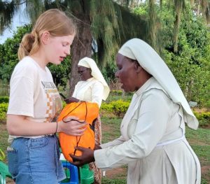 Toen naar de Zusters waar we gingen middag eten en die avond ook gaan slapen. De meiden gingen afwassen en de jongens de grote tassen uit de bus halen.