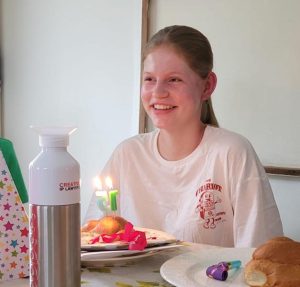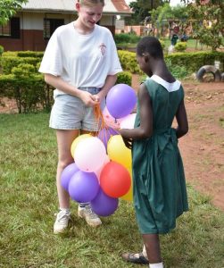 Na een lange nacht voor de meeste kinderen, 10 tot 11 uur lang geslapen, gingen we om 8 uur aan het ontbijt. Met brood uit de bakkerij van Bake for Life, ei en fruit begon de dag goed. En het werd nog heel feestelijk omdat Judith jarig is. Met kaarsjes uitblazen, zingen en kadootjes was het een bijzonder moment voor haar om jarig te zijn in Oeganda.